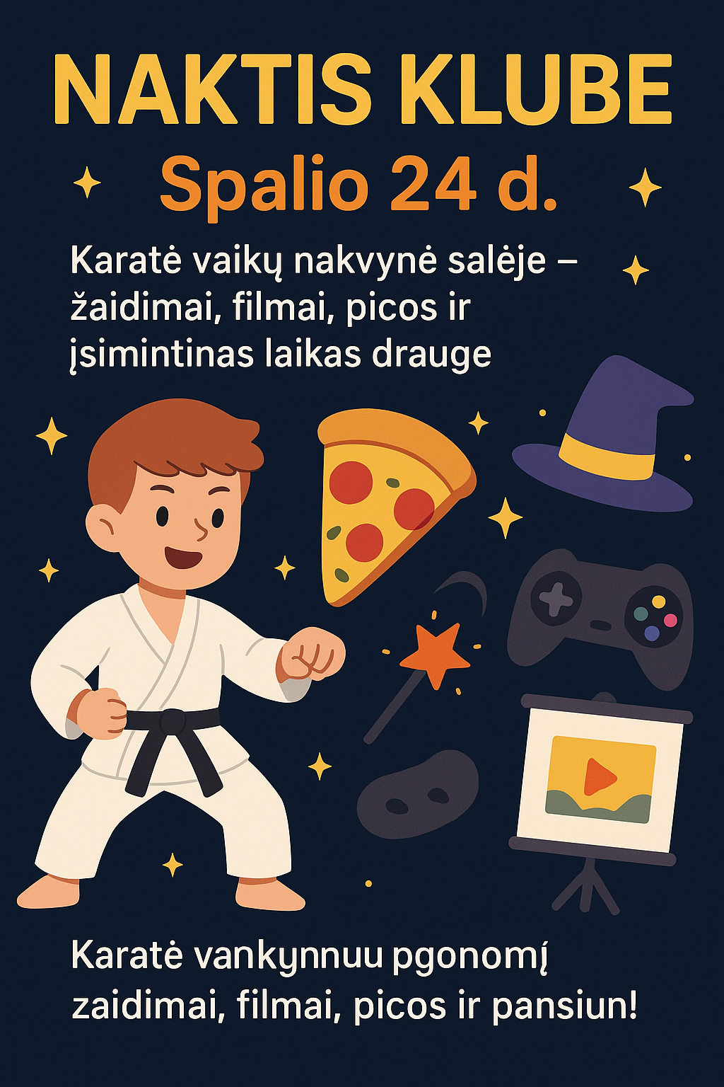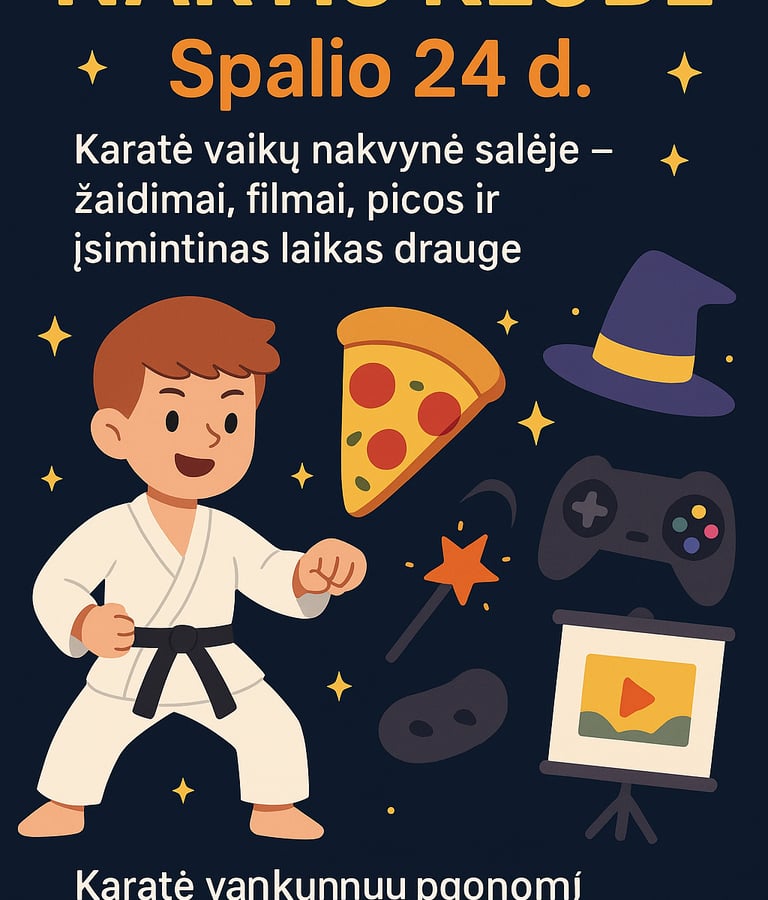 Vaikų laukia žaidimai, pramogos, filmas, šiek tiek technologijų ir nakvynė karate salėje!🌙🍕🎮